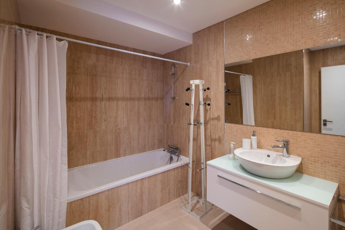 Apartment with Balcony. The pool with a view is the standout feature of this apartment. Boasting a private entrance, this air-conditioned apartment features 1 living room, 2 separate bedrooms and 1 bathroom with a walk-in shower and a bath or a shower. Guests will find a stovetop, a refrigerator, a dishwasher and kitchenware in the kitchen. The apartment also comes with a barbecue. The spacious apartment features a washing machine, soundproof walls, a coffee machine, a flat-screen TV with cable channels, as well as garden views. The unit has 3 beds.